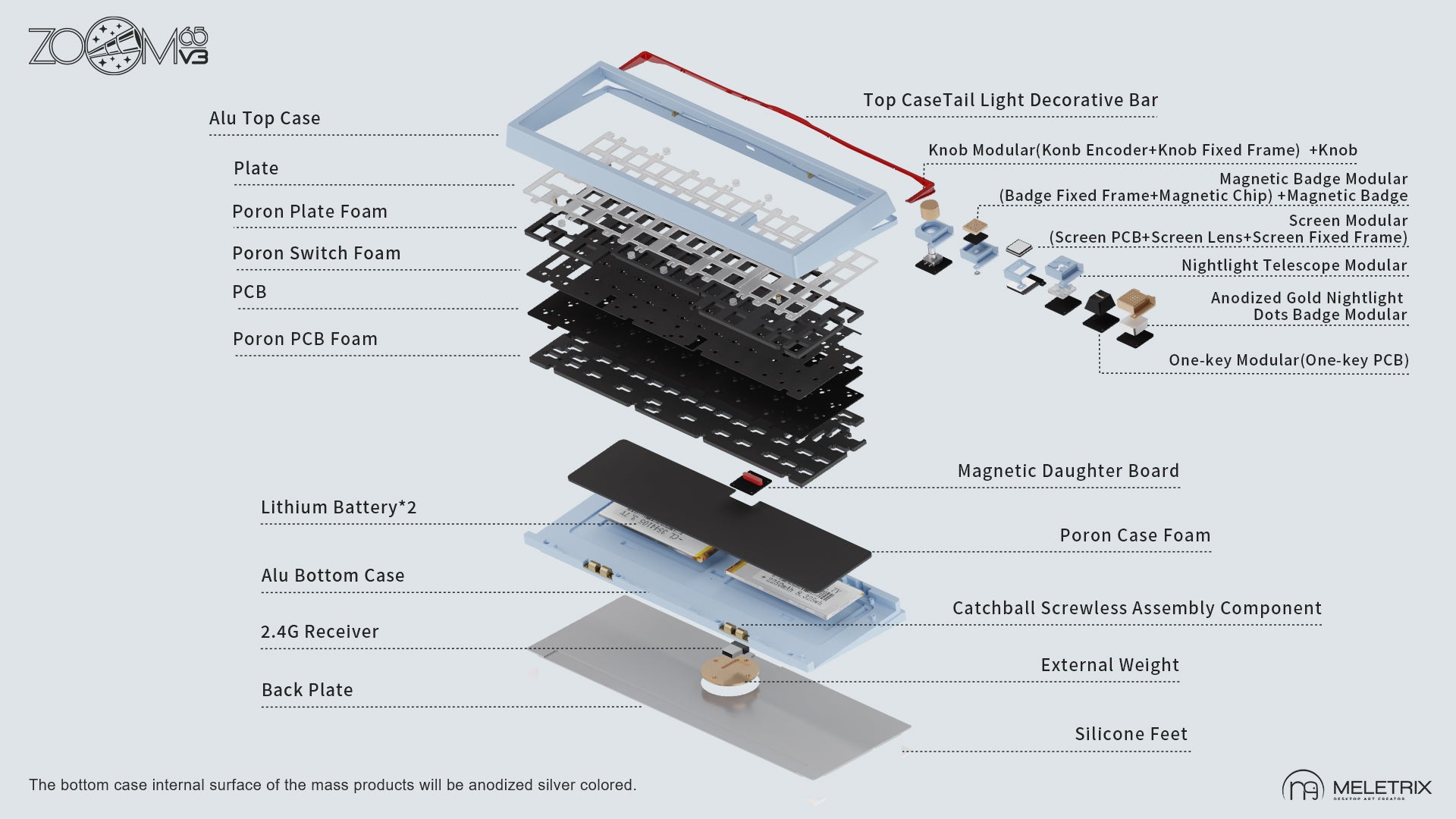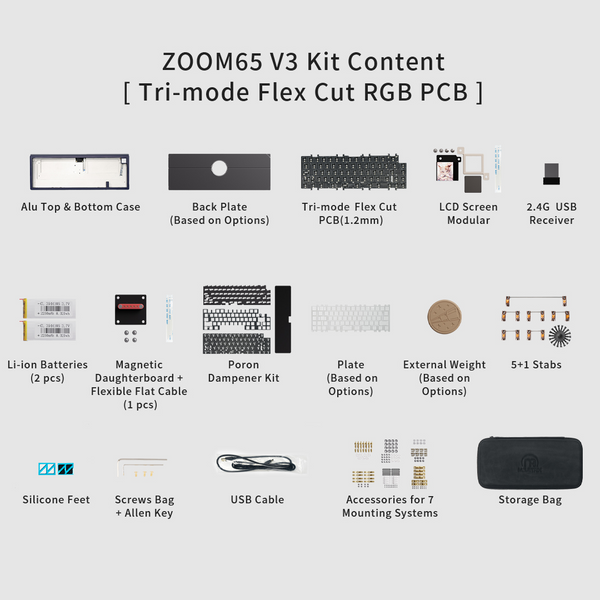 Presentamos el Meletrix Zoom65 V3, el teclado más nuevo de la serie Zoom. Esta versión revisada presenta cinco nuevos colores, un sistema de ensamblaje rápido, siete estilos de montaje y conectores magnéticos para la PCB.